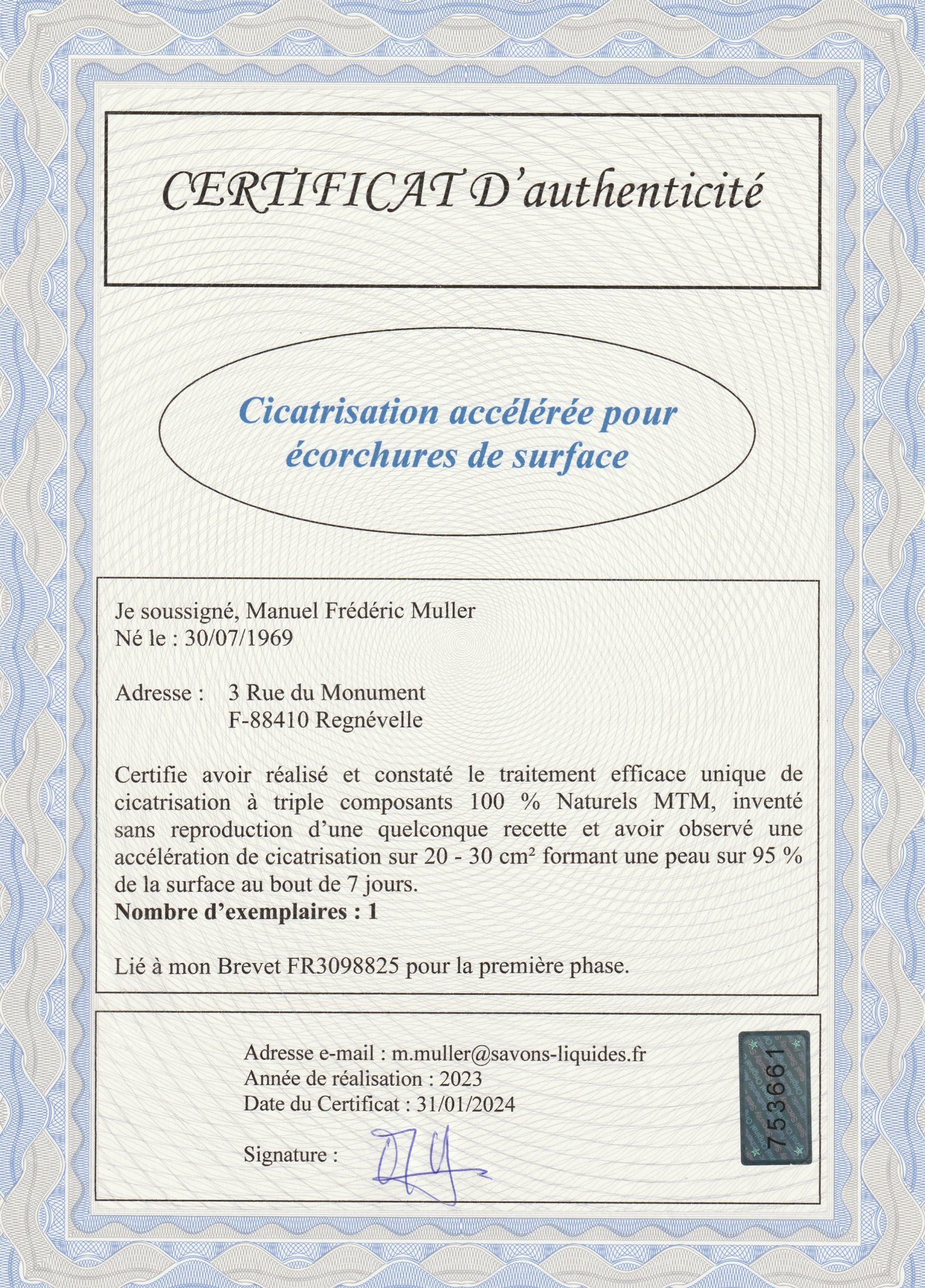 Il s’agit d’une composition avec Certificat de conformité de l’Inventeur de cette application cutanée sur blessures superficielles, c’est à dire de faible profondeur. Les fortes profondeurs (supérieur à 3 mm) peuvent aussi être traitées mais n’ont pas été testées.